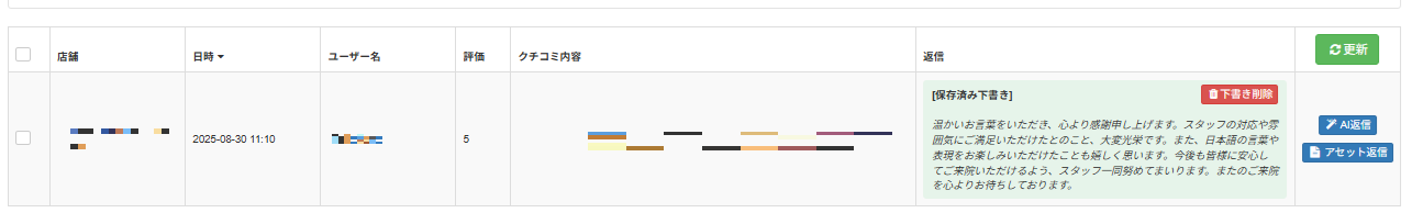 お客様のクチコミ内容に基づいた、AIによる返信文案が表示されます。