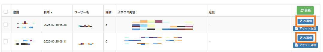 - クチコミの一覧が表示されますので、返信したいクチコミを選び、「AI返信」ボタンをクリックします。