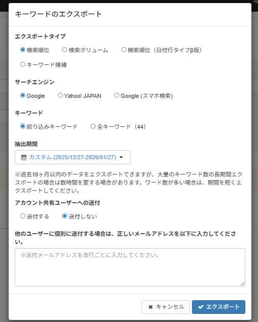 ※出力するキーワードデータや期間が長い場合、出力に30分~1時間かかる場合がございます。